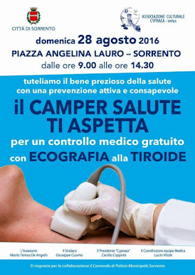 Sorrento - L’Associazione Culturale Cypraea onlus ha portato a termine, dopo un lungo e faticoso periodo di impegno, il Progetto “Camper Salute ”, ambulatorio mobile attrezzato delle tecnologie sanitarie utili a svolgere azioni di tutela per diverse specialità mediche finalizzate ad aiutare la comunità della Penisola Sorrentina, con particolare attenzione alle zone periferiche. Il “Camper Salute Cypraea” ha iniziato la sua Campagna di Prevenzione dall’11 febbraio 2016 prediligendo attualmente il settore diagnostico della senologia e della tiroide. L’ adesione da parte dei cittadini è stata numerosissima e ha dimostrato quanto sia necessaria l’attenzione posta verso una diagnosi preventiva per malattie molto diffuse nel territorio. Il “Camper Salute Cypraea” per poter soddisfare le numerose richieste pervenute, sarà in Piazza Angelina Lauro a Sorrento domenica 28 agosto dalle ore 9.00 alle ore 14.30 per un controllo medico gratuito alla tiroide con relativa ecografia grazie all’ eco color doppler ultrasound Z6 multifunzione acquistato dall’Associazione Cypraea. Spiega Cecilia Coppola, presidente dell’Associazione Culturale Cypraea onlus, “Importante è far avvicinare alla prevenzione e alla salvaguardia della propria salute coloro che normalmente non lo fanno per reticenza, per poca attenzione o per difficoltà economiche. Il buon esito del nostro impegno socio-sanitario è stato coronato dalla professionalità, serietà e collaborazione pienamente gratuita dell’equipe medica coordinata dal dott. Lucio Vitale, primario radiologo degli Ospedali Riuniti di Vico Equense e Sorrento, specialista in tiroide e senologia”. Sarà presente all'iniziativa la dottoressa Rossella Gargiulo biologa nutrizionista per fornire consigli nutrizionali alle persone affette da patologia tiroidea. Il Sindaco Giuseppe Cuomo e l’Assessore Maria Teresa De Angelis hanno aderito a tale campagna comprendendo che la salute è un bene prezioso che richiede impegno e sostegno.