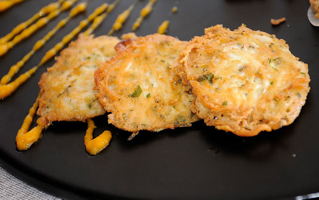 Una bella responsabilità -i coperti sono parecchi- ma le tecniche primarie ed il senso del gusto non mancano. Niente male per uno diplomato in pasticceria, dove la precisione è fondamentale. Ma Loris si annoiava a far pasticceria, però quel tratto fine e delineato ti rimane dentro; è proprio quello che serve anche per sviluppare le preparazioni salate. Lo vedi dai dettagli, come la forma precisa di queste frittelle di rossetti.